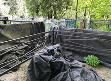 На фотографиях видно, как мы готовим оградку к покраске. Перед началом проведения работ мы обязательно укрываем плотной тканью как участок клиента, так и окружающие его места захоронения, чтобы случайно попавшая на памятники краска не создавала лишних проблем.